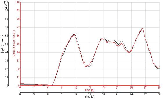 Once you entered an equation for wheel speed, it is best to check that the scaling has been calculated correctly. To do this the simplest thing to do is to plot a graph of wheel speed and “normal” speed and compare them to make sure they are very similar. For example: