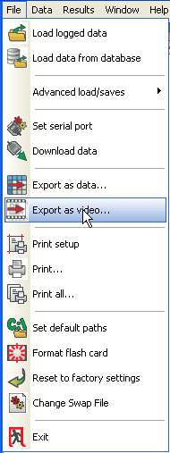 Firstly load and synchronize the video and run data in Analysis. Once this is done go to Export as video in the File menu: