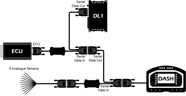 DL1 or DL2 data logger, ECU Interface, AnalogueModule8 and DASHx