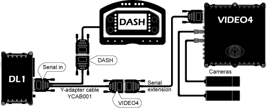 Please note that in this configuration it is important that both the DL1, DASH display and the VIDEO4 are configured to work together correctly. There is more information about this on these pages:
