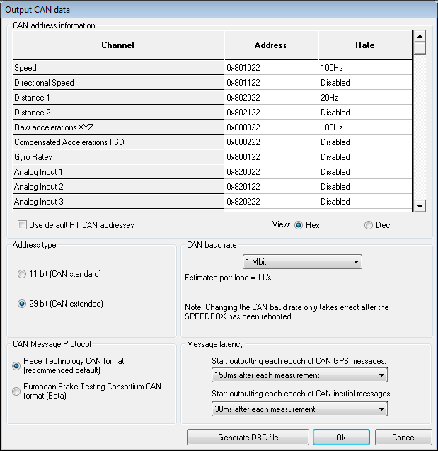 By ticking the box ‘Use default RT CAN addresses’, all addresses will be reset to the default values which work with the .dbc file available for download from the Race Technology website. This is recommended unless different CAN addresses are specifically required.