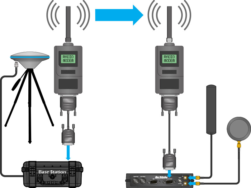 Setup the system as shown in the diagram below. The SPEED100 will work with any base station capable of transmitting RTCM v3.x corrections. Ensure that the radio modem attached to the base station and the radio modem attached to the SPEED100 are transmitting and receiving on the same frequency, and will work together.
