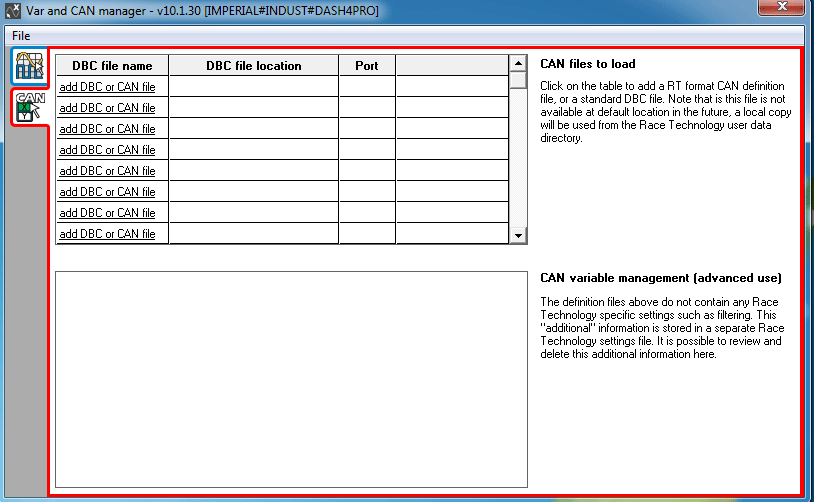 Note that the Race Technology software has no facility to create or edit the DBC file, only load and use it. In many applications the DBC file will be supplied to the end user from the equipment supplier, alternatively there is a free toolset that can be used to generate and edit the files "CANdb editor", Race Technology Ltd do not supply or support this software, but it is freely available from the internet.