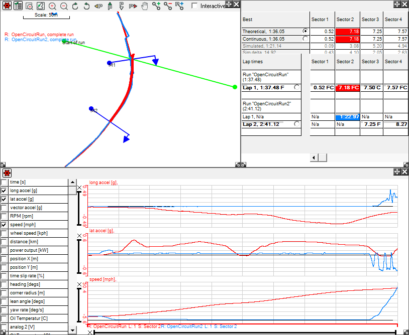 When doing analysis on “open circuits” typical of hill climbs and sprints, rather then closed laps, there are some considerations and techniques. The key difference when considering open laps is that with a closed circuit you need to add a “lap marker”, which is a special track marker and it’s shown in red: