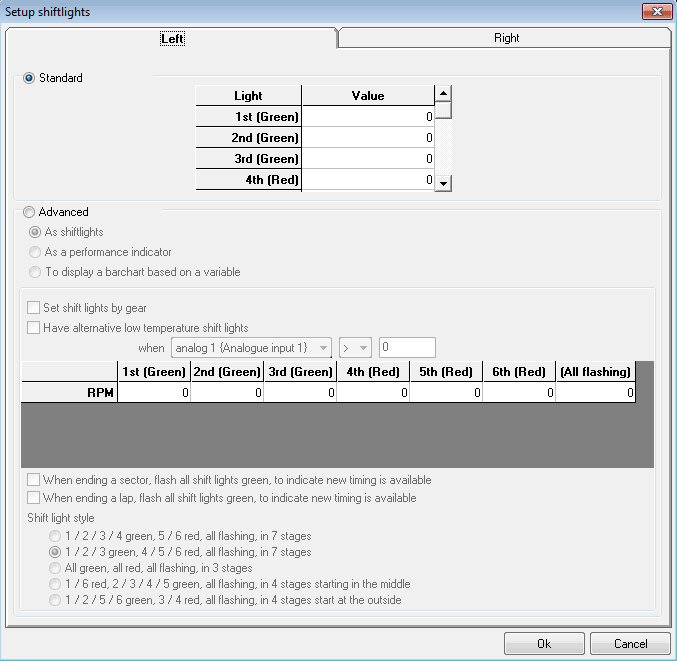 There are two levels of settings for the shift lights, Standard and Advanced.
