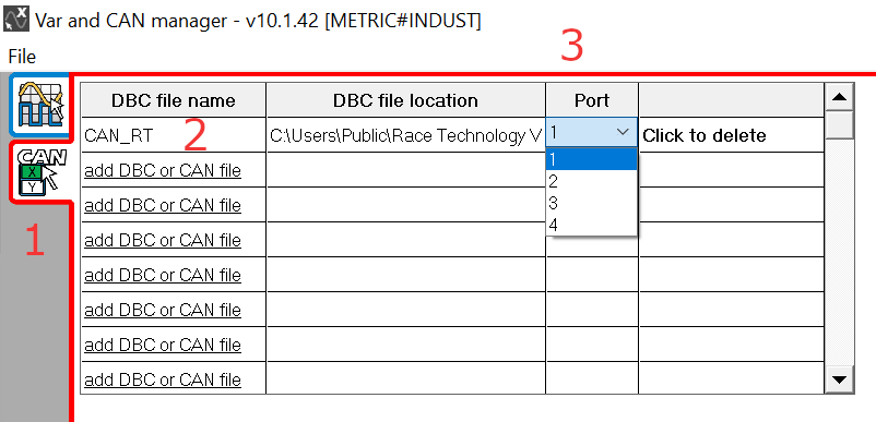- Click on “Click to add” link under “DBC file name” column to add a new .DBC file (2)