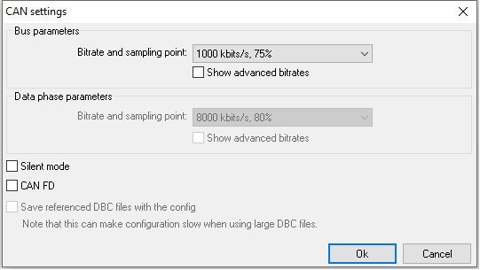The CAN baud rate and CAN ID length need to be set according to the CAN device configuration. Default settings are 1 Mbit and 29-bit. If Silent mode is ticked, the acknowledgement on reception of every CAN message will be off. Silent mode should be off for unless specifically required.