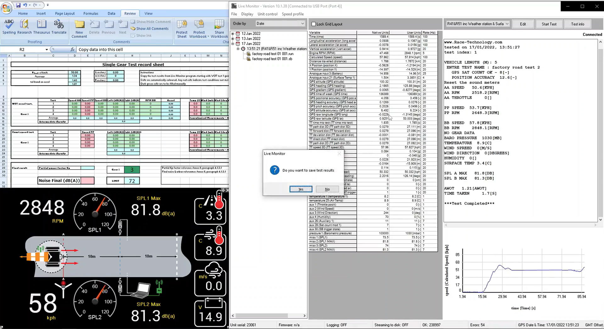 El software Live Monitor se utiliza para mostrar datos en vivo, revisar resultados y realizar pruebas. El software combina automáticamente los datos de los medidores de sonido, los datos de la estación meteorológica y los datos del vehículo que se reciben a través del módem. Estos datos combinados se utilizan luego para realizar pruebas de paso y los resultados de cada prueba individual se muestran al instante. El resultado final del ruido de paso se calcula combinando varias pruebas y se completa seleccionando los resultados de la prueba y exportándolos a la hoja de cálculo del informe suministrada.