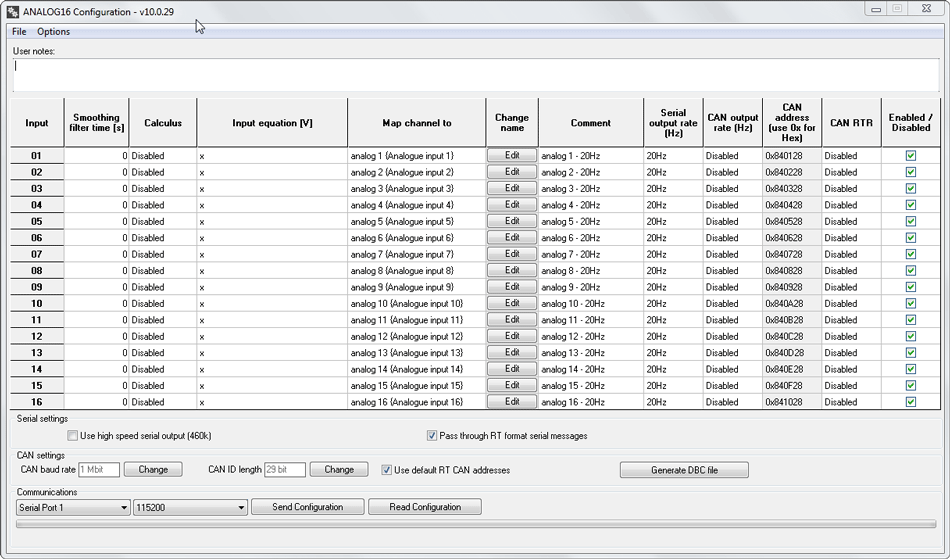 Each channel can be individually enabled or disabled globally with the tick box on the right hand side, output rates for Serial and CAN can be independantly set from the drop down menus. Remote Transmission Requests for the CAN output can be enabled or disabled individually for each channel in the CAN RTR column.