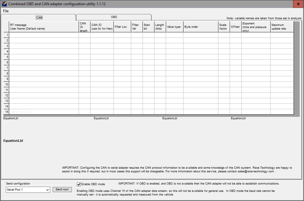 The configuration of the interface module is performed using the CAN configuration software, which is a standard part of the Race Technology V7 software installation. This can be found in the configuration section of the installation. When started, the CAN Configuration software will look like this: