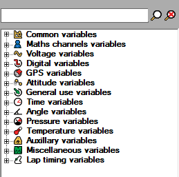It is a list of variables that can be assigned to the controls. All of the variables can be categorized into fifteen major groups. (CAN variable category will be shown only when at least one CAN/DBC file is loaded)