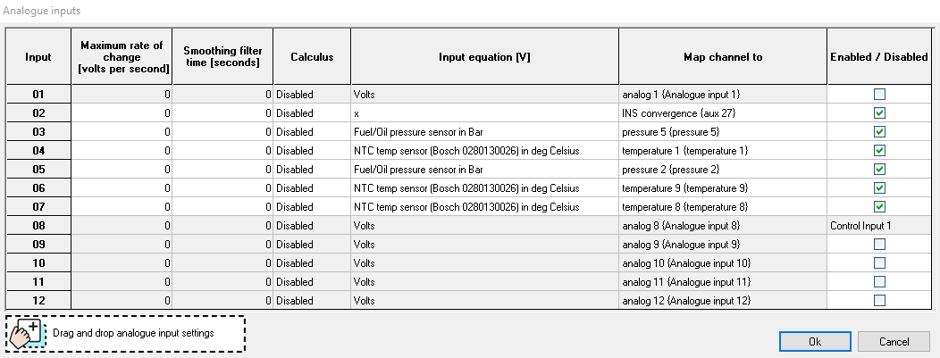 When adding new sensors, start with the lowest number analogue input and work upwards. The inputs at the top end can be used for other purposes.