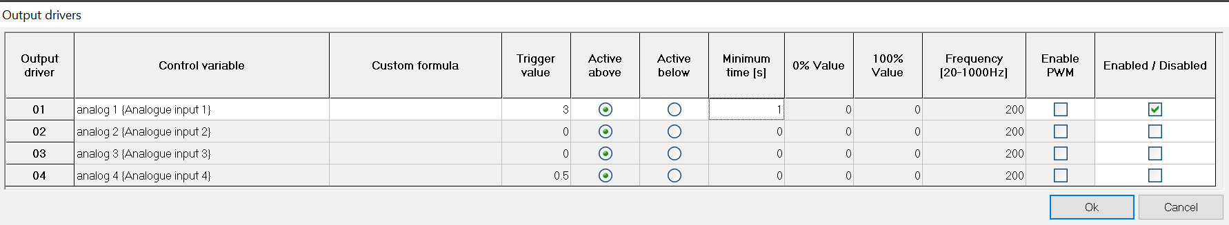 The output pins are configured from the Output Drivers icon on the DL1 FD/DL2 FD configuration software.