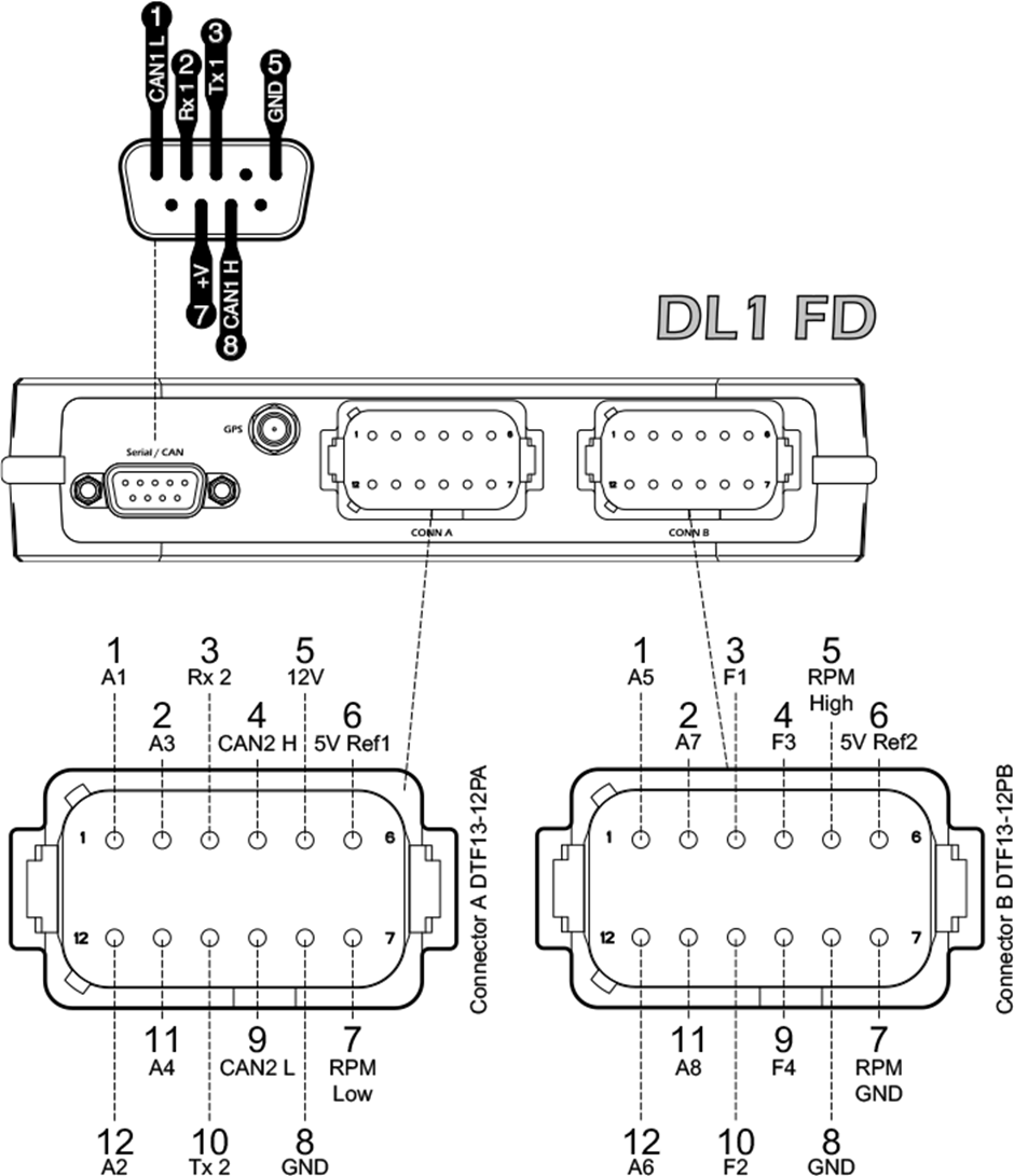 | This single connector actually connects to 2 serial ports and a CAN port. One of the serial ports is generally used to connect to a display unit, such as a DASH2, the other to an ECU interface.