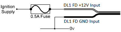 Connect the DL1 FD to a fused power source, which is available when the ignition is turned on. Connecting to a permanent power source will cause the DL1 FD to drain the battery continuously. We would recommend a 0.5A fuse for most applications. However a 1A fuse may be required if using the output drivers optional enhancement, as these additional connections can increase the current draw - depending on what is connected. Please do not connect anything to your car unless you are confident in what you are doing!