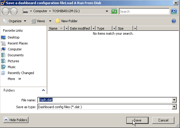 step 19: This will open up a window that allows you to save your configurations onto a memory card. The file that you are saving must be called "Dash.dat".