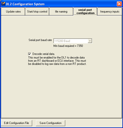 - Switch to the Serial port configuration tab. Make sure that Decode Serial data check box is ticked. This must be enabled for the DL1 or DL2 to decode data from the DASH2