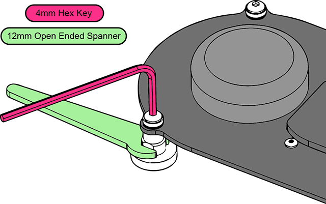 Loosen the hex bolts at the top of the two front legs using a 12mm open-ended spanner to hold the leg, and a 4mm hex key to loosen the hex bolt.