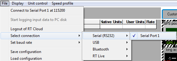 Once the file menu is open, the first sub menu item, “Connect to xxxxxxxx at 115200” shows the last used connection method and the baud rate used.