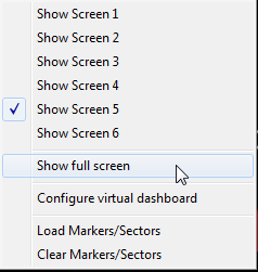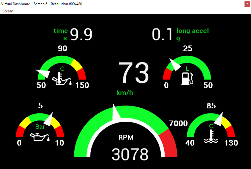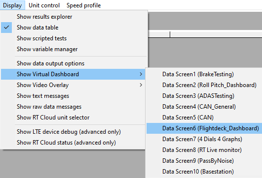 The Virtual dashboard consists of 10 configurable data screens which can be used to display any of the variables within the software. To load up the Virtual dashboard, go to Display -> Show Virtual dashboard.