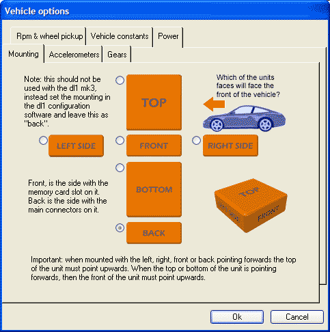 The Analysis software can be configured depending on the orientation of the DL1 data logger in the car. Simply selecting the correct mounting orientation from the menu will adjust the readings from the accelerometer.