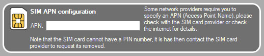 To configure the SIM card: The APN or Access Point Name is the URL used for a connection to the gateway between your carrier's cellular network and the public Internet. The APN URL depends on the SIM card provider.