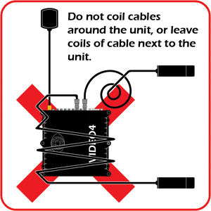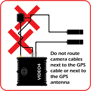 To ensure your VIDEO with GPS works reliably it is important to ensure the crucial components of the system (the video cameras and GPS antenna) are not subject to electrical interference from each other. We recommend that the GPS cable and antenna are routed through the opposite side of the vehicle to the bullet cameras and cables,and the cameras are kept at least 60cm (2ft) away from the GPS antenna.